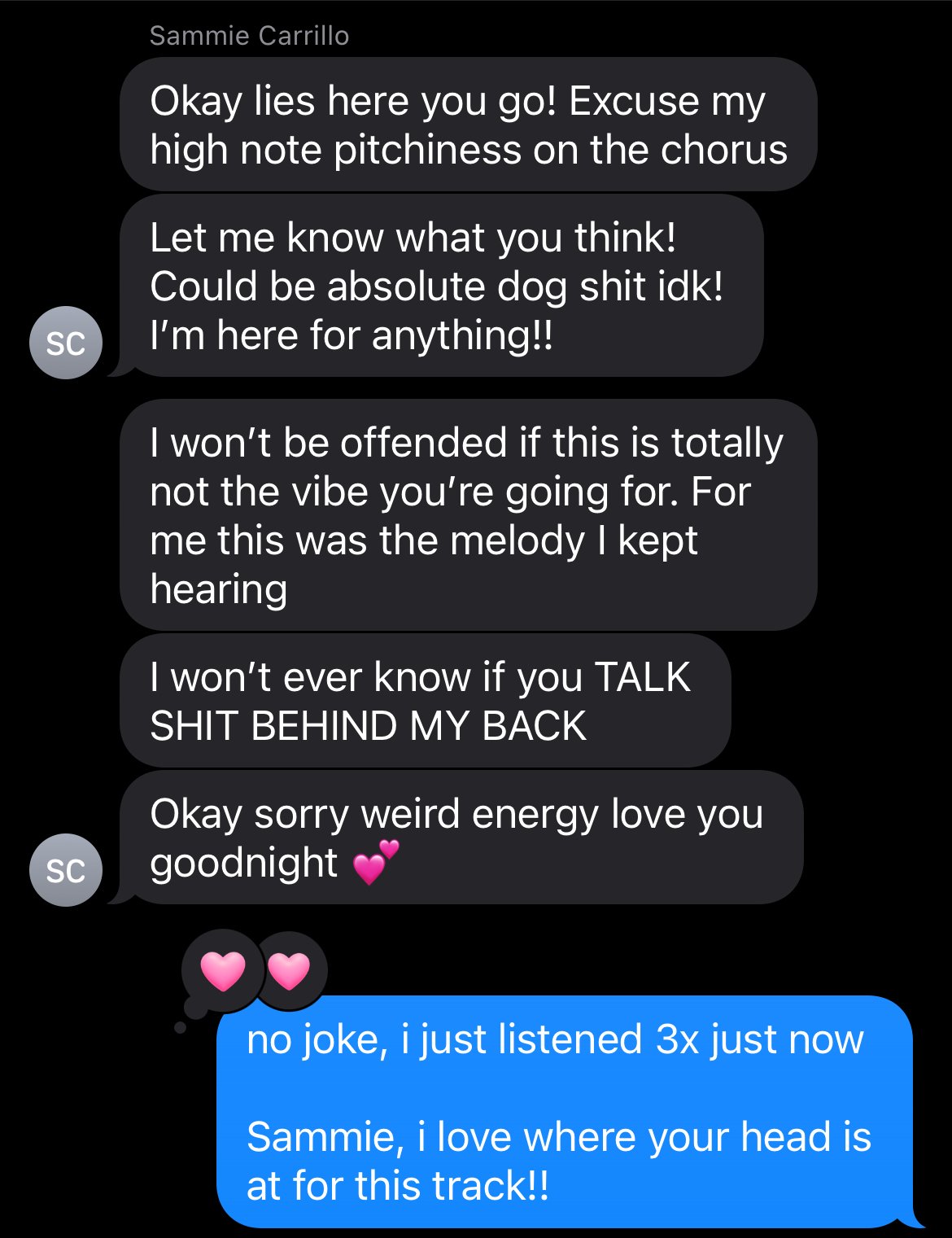 Sammie told me later she was nervous to send it. She’d recorded the vocals quietly late at night with her neighbor yelling through the walls, completely raw and unfiltered. “It was scary sending something that vulnerable to someone I didn’t know well,” she said. “But I told myself, worst case, it’s a pass. Best case, it turns into something beautiful.”